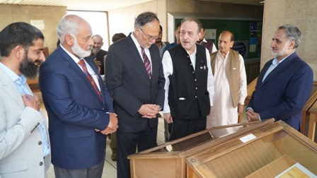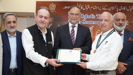 Professor Ahsan Iqbal, accompanied by Dr. Abdul Rauf Rafiqui, Director of Iqbal Academy Pakistan, paid a visit to the mausoleum of Allama Iqbal. Professor Ahsan Iqbal awarded Dr. Muhammad Arif Khan the Presidential Award for his Urdu book on Iqbal, titled "Kamal-e-Iqbal Aur Ikisween Sadi" (The Greatness of Iqbal and the 21st Century).