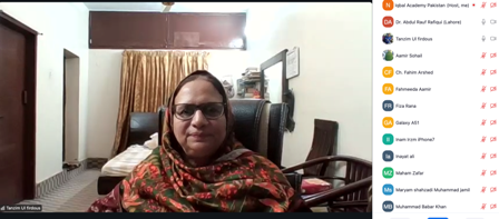 Iqbal Academy Pakistan, Lahore (February 15, 2025) – On the 156th death anniversary of Mirza Asadullah Ghalib, Iqbal Academy Pakistan organized an online lecture. The guest speaker, Professor Dr. Tanzeem-ul-Firdous, former head of the Department of Urdu, University of Karachi, and General Secretary of Idara-e-Yadgar-e-Ghalib, presented a well-articulated paper on "The Nature of Ghalib's Influence on Iqbal's Thought."