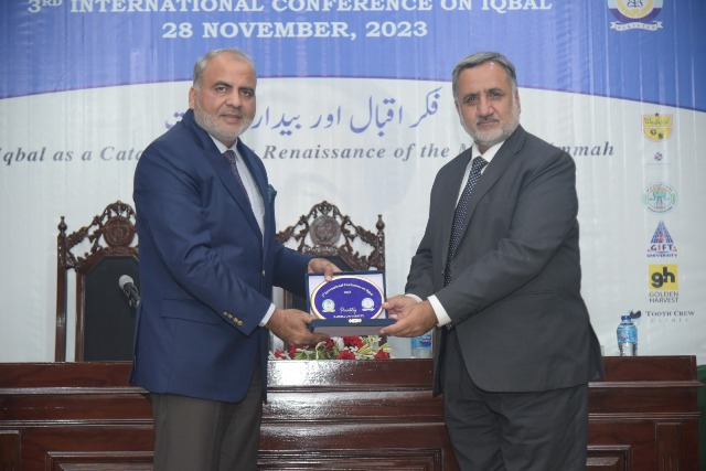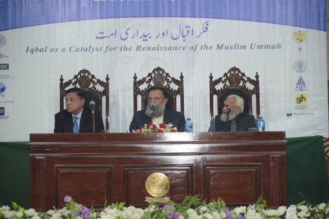 ڈاکٹر عبدالرؤف رفیقی نے خطاب کرتے ہوئے کہا کہ علامہ محمد اقبال رحمۃ اللہ علیہ کی شاعری اور نثر کا مطالعہ کیا جائے تو یہ بات واضح ہوتی ہے کہ اس میں اتحاد، اسلام اور نبی صلی اللہ علیہ وسلم سے محبت، استعماری قوتوں کے خلاف صداے احتجاج، مغربی تہذیب سے احتراز، امت مسلمہ کی بیداری اور نشاۃ ثانیہ کے پہلو بدرجۂ اتم پائے جاتے ہیں۔علامہ امت مسلمہ کو اپنے دینی، سیاسی، انفرادی اور اجتماعی معاملات میں اپنے اصل منبع اور مرجع کی طرف رجوع کرنے اور ان سے تائید و نصرت طلب کرنے کے لیے نصیحت کرتے ہیں۔بلا شبہ، اللہ تعالیٰ کی تائید و نصرت شامل حال ہوتی ہے، مگر اس کییہ سنت انھی لوگوں کے لیے کار فرما ہوتی ہے جو اس کی راہ پر چلتے اور اس کے احکام پر عمل پیرا ہوتے ہوئے اپنے آپ کو اس کے قابل بناتے ہیں۔ امت مسلمہ کی بیداری کے لیے اصل منبع اور ماخذ قرآن مجید اور رسول اللہ صلی اللہ علیہ وسلم کی ذات مبارکہ ہے، علامہ اقبال علیہ الرحمۃ نے بھی اس کے لیے اصل سرچشمہ اور مرجع قرآن مجید ہی کو قرار دیا ہے۔